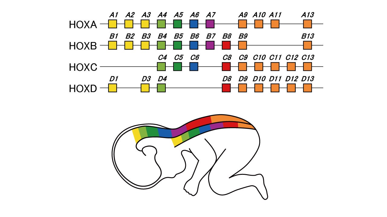 HOX遺伝子は個体の胚発生の初期において身体の構造(頭、胸、腹など)を決定する重要な遺伝子群です。これまでにヒトでは39種類のHOX遺伝子が同定されています(図2)。HOX遺伝子は胚の前後軸に沿った特定の領域で発現し、身体の各部位の形成を決定しています。近年では、胚発生段階だけでなく、成体においてもHOX遺伝子が機能を有することが報告されています。本研究では、HOX遺伝子が皮膚弾力の部位差にも影響を及ぼすと考え、研究を進めました。