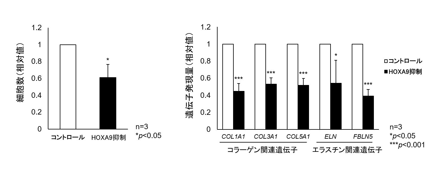 これらの結果から、身体では特異的にHOXA9遺伝子が発現していることで、顔に比べてコラーゲン、エラスチンの産生が促進され、皮膚の弾力を高めていると考えられました。
