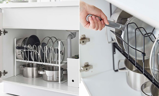 フライパンや鍋蓋を立てて収納でき、高さ調節できるから下のスペースも有効活用!