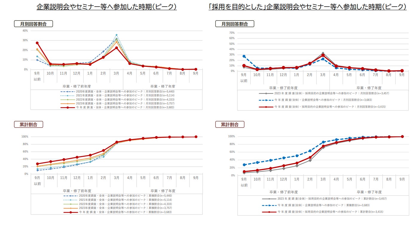 内閣府の調査による「企業説明会等に参加した時期(ピーク)」「『採用を目的とした』企業説明会・セミナーに参加した時期(ピーク)」のデータからは、学生の行動が年々早期化していることが明確に読み取れます。