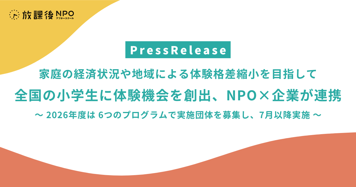 「日本中の放課後を、ゴールデンタイムに。」をミッションに活動する 特定非営利活動法人 放課後NPOアフタースクール(代表理事:平岩国泰、本部:東京都文京区/以下「放課後NPOアフタースクール」)は、家庭の経済状況や地域に関係なく、すべての子どもたちが体験機会を得られる社会を目指して活動を続ける中、2026年度もパートナー企業と協働して、日本全国の小学生の居場所に体験活動を届けます。6つの企業協働プログラムにおいて実施団体の募集を行い、7月以降から順次実施します。