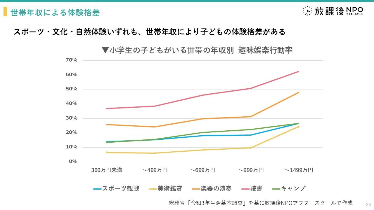 総務省の「令和3年生活基本調査」によると、世帯年収が高い家庭ほど、子どもの体験活動が充実しているとの結果が出ており、家庭の経済状況による体験の格差が生まれていることが示唆されます。
