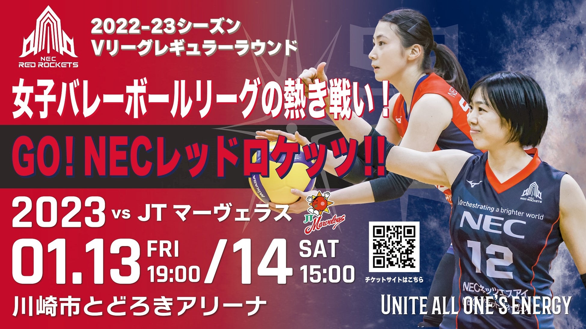 天皇杯・皇后杯 全日本バレーボール選手権大会で初優勝を飾ったNECレッドロケッツが再びVリーグの舞台に戻って来る!2023年1月13日(金)、14日(土)のホームゲームは、シーズンスローガンであり、チームを皇后杯優勝に導いた「輝 -UNITE ALL ONE'S ENERGY-」をテーマとし、とどろきアリーナにて開催!