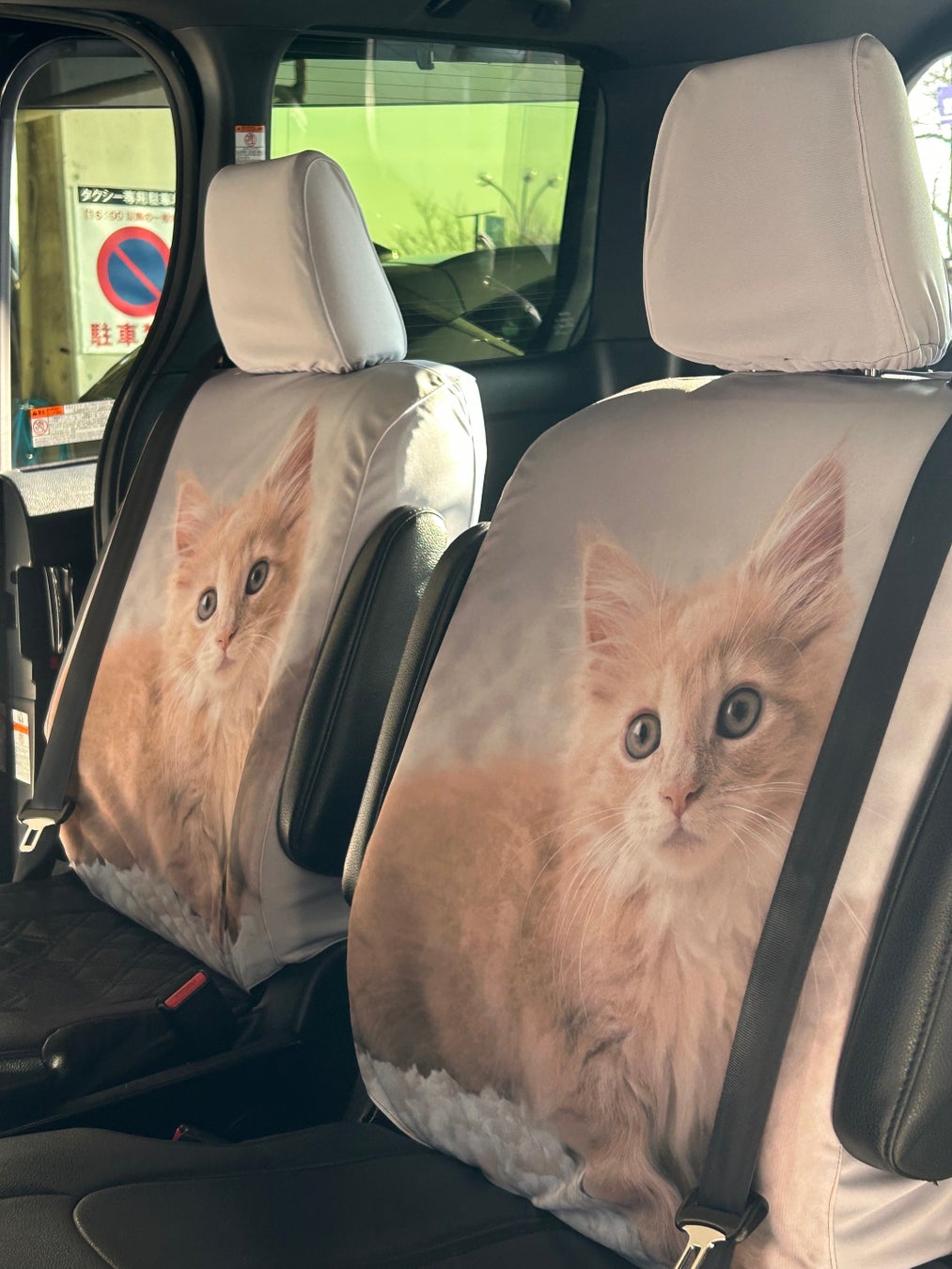 株式会社リードからレンタルしたねこシートは愛らしい猫柄プリントで、車内が明るく楽しい雰囲気に!
