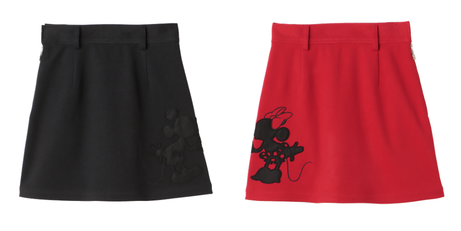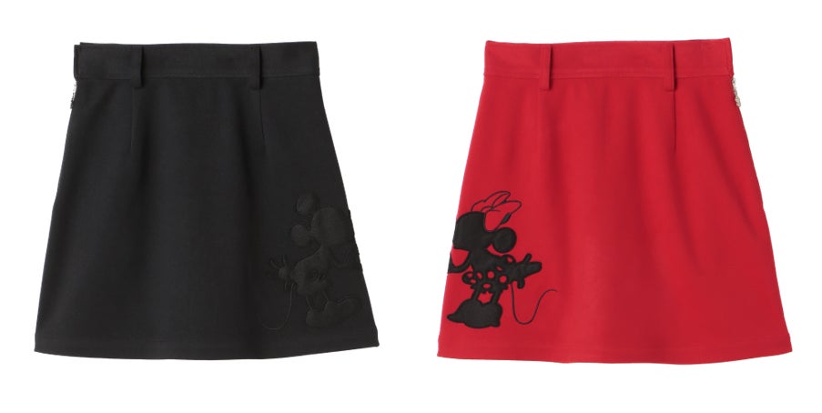 手でハートを作るミッキーマウスとミニーマウスのシルエットがキュートなスカート。色違いをペアで着用すると、ハートハンドサインが完成する遊び心あるデザイン。
