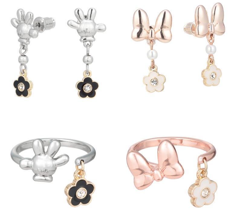 ミッキーマウスのグローブとデイジーのモチーフで大人かわいいスタイルに。ディズニーモチーフの下にデイジーが揺れるピアス。シルバーはミッキーマウスのグローブモチーフ、ピンクゴールドはミニーマウスのリボンモチーフにデイジーを組み合わせたデザイン。