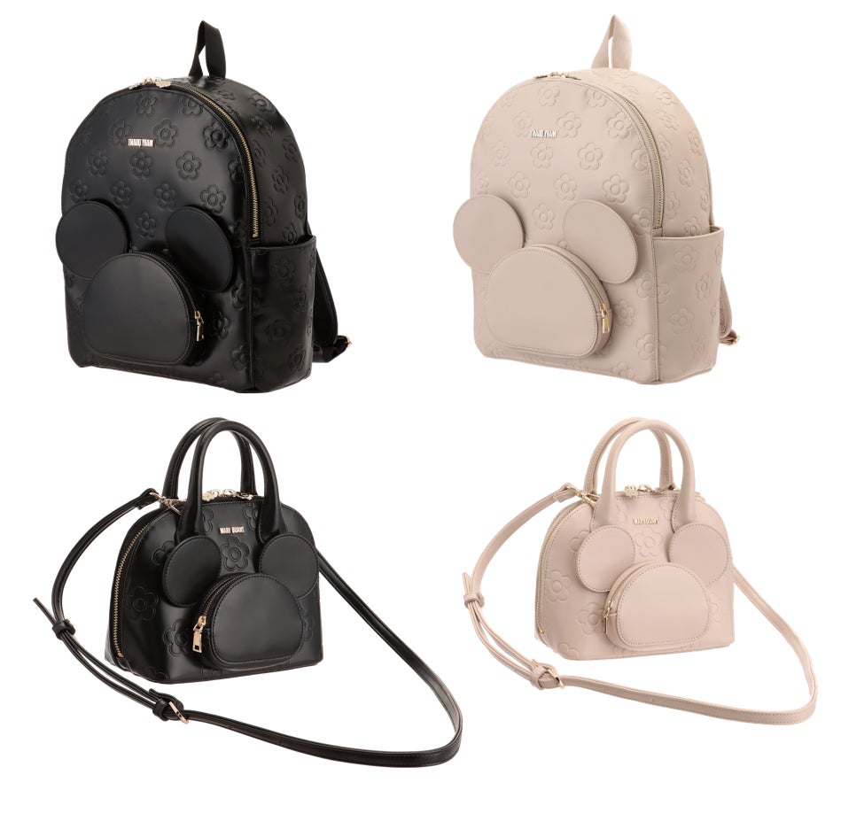 ポケットからミニーマウス(ミッキーマウス)が顔を覗かせているようなデザイン。前ポケットはぷっくりとしたデイジーがエンボス加工でちりばめられています。