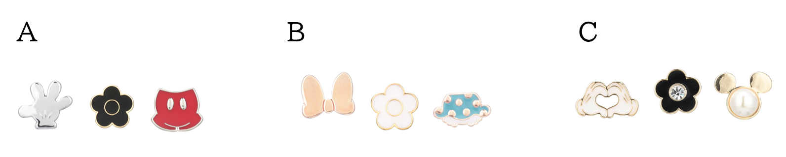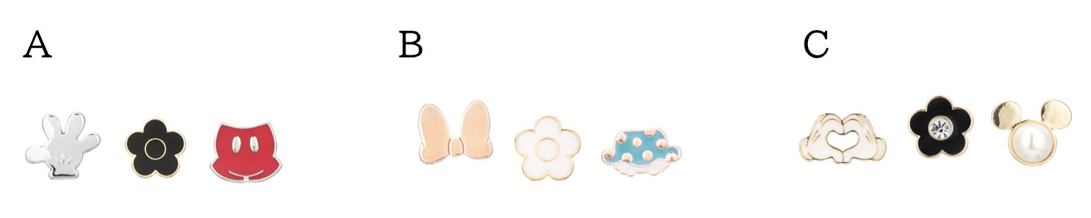 カラーによってそれぞれ異なるモチーフがセットに。ディズニーのモチーフが3つセットになったピアス。