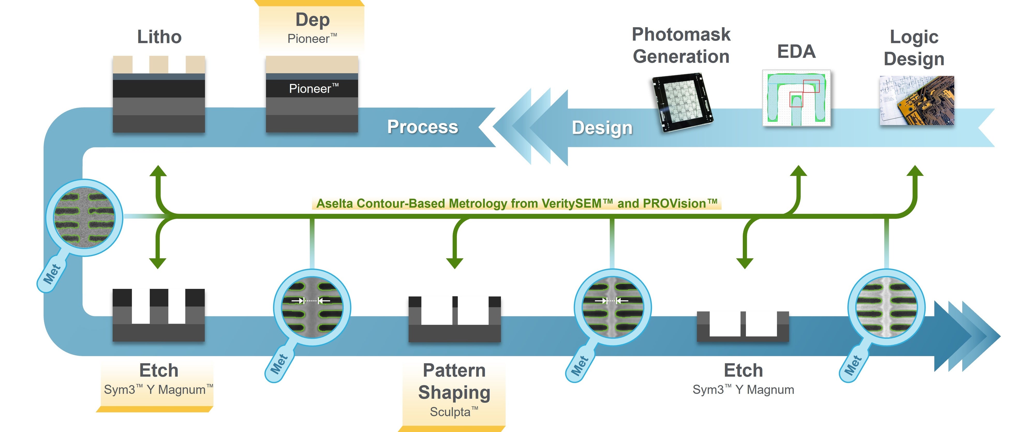 アプライド マテリアルズが先に買収したAselta Nanographicsは、輪郭を利用するデザインベース測定技術のリーダーです。輪郭を利用することで、パターニング技術者はデザインレシピがパターニング膜やウェーハ上に生成する形状についての膨大なデータを得ることができます。このデータをリソグラフィやプロセスフローにフィードバックすれば、より正確なフィーチャーや配置を生成することができます。