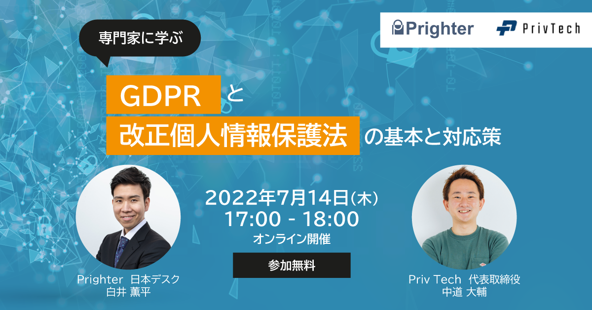 【共催Webセミナー】Prighter × Priv Tech株式会社『専門家に学ぶ「GDPR」と「改正個人情報保護法」の基本と対応策』7月14日(木)17時開催