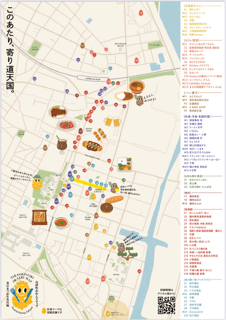 紙版「高砂町おかえりマップ 食にまつわるお店編」では、地域の飲食・喫茶・菓子・買い物店等の拠点を掲載し、地域を歩くきっかけを提供しています。加えて、高砂町全体の輪郭を示し、自治会一覧や関連情報にも触れられる構成としています。