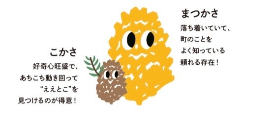 また、案内をよりわかりやすく届けるため、松ぼっくりをモチーフにしたキャラクター「まつかさ」(大)と「こかさ」(小)を導入します。両者は、性別という概念を持たない“松傘のこびと”として、高砂の町を歩きながら、地域の魅力を集めて案内するナビゲーター役を担います。