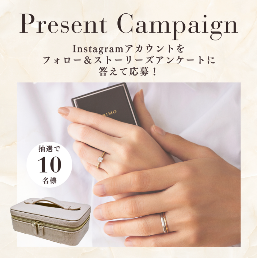 本キャンペーンは、アイプリモ公式Instagramのアカウントをフォロー、期間中に投稿されるストーリーズの質問に回答するだけで、ご参加いただいた方の中から抽選で10名様にアイプリモオリジナルバニティジュエリーケースをプレゼントいたします。キャンペーン期間中、一度でも回答いただいた方は対象となり、何度でもご参加いただけます。毎日17時頃にストーリーズが投稿されますのでどうぞお楽しみに。皆様のご参加をお待ちしております。