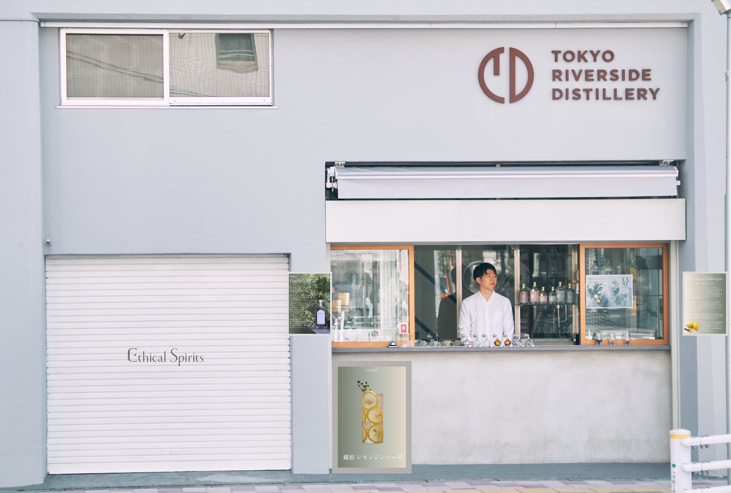 蒸留所の路面側にて、エシカル・スピリッツのジンを「ボトル」や「テイクアウトドリンク」で購入いただけます。ガラスの奥の蒸留所を覗きながら、スタッフによるジンのストーリーやボタニカルのお話、香水瓶で試すジンの香りをたよりに、お気に入りの一杯を見つけてください。