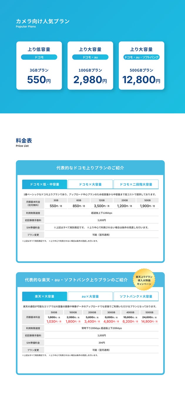 防犯・監視カメラの映像など大容量データのアップロードといった用途に特化したSIMサービスサイトです。1GB〜1000GBまでの大容量プランの取り扱いをはじめ2024年6月から4キャリア(docomo、au、Softbank、楽天)の提供も開始したことからIoTBiz SIMサービス全体で100以上のラインナップを取り揃えています。