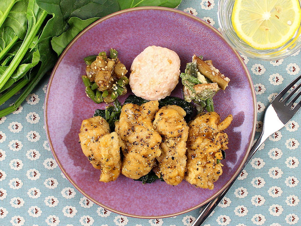 副菜は、いんげんとゴボウのおかかあえ、一味をきかせた山菜のおろしマヨ、カニ豆腐つくねです。