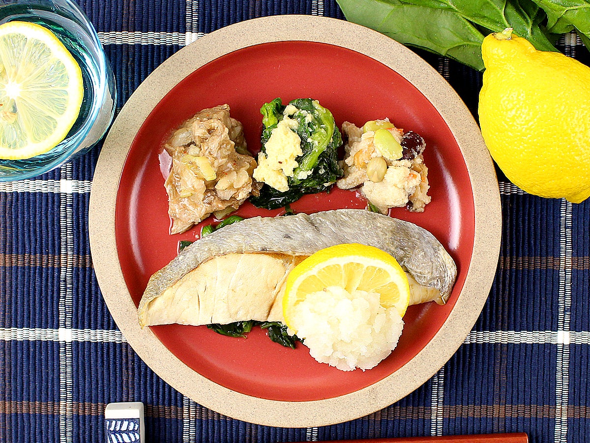 「シルバー」という別名を持つ白身魚の銀ひらすを、あっさりと塩焼きでご用意しました。ほうれん草と大根おろしにレモンを添え、さっぱりと食べやすく、見た目も爽やかに仕上げております。200kcal以下でヘルシーかつ塩分控えめで優しい味わいです。