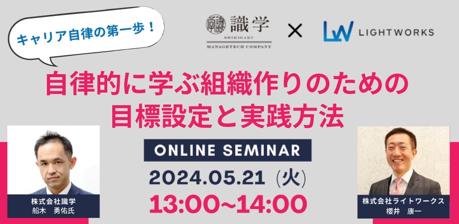 企業向け学習管理システム(LMS)「CAREERSHIP🄬」やeラーニング受け放題サービス「まなびプレミアム」などを提供する株式会社ライトワークス(本社:東京都千代田区、代表取締役:江口夏郎、以下「ライトワークス」)は、2024年5月21日(火)に、「自律的に学ぶ組織作りのための目標設定と実践方法」をテーマに、マネジメントコンサルティングの株式会社識学(本社:東京都品川区、代表取締役社長 安藤広大氏、以下「識学」)と共催ウェビナーを開催します。