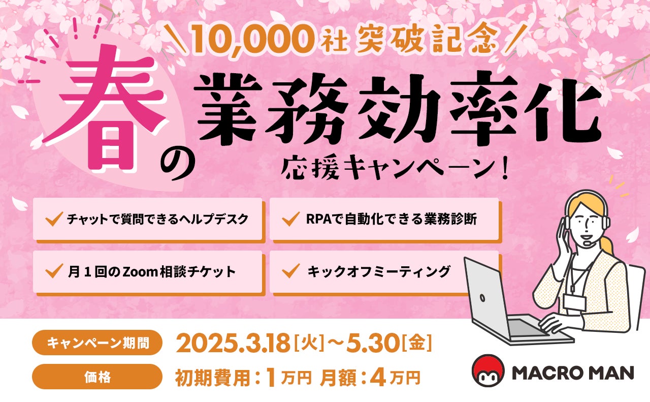 この機会に、より多くの方にマクロマンのサポートサービスをご活用いただきたいという思いから、 2025年3月18日(火)~ 5月30日(金)までの期間、「10,000社突破記念!春の業務効率化応援キャンペーン」を実施いたします。