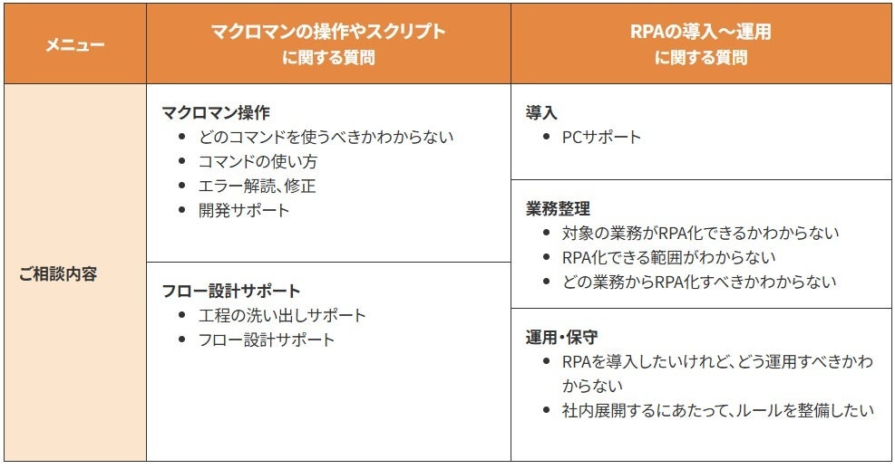 マクロマンの使い方やエラーの対処方法、安定するスクリプト(シナリオ)の作り方をアドバイスしてほしいなど、契約期間中いつでもチャットでご質問いただけます。