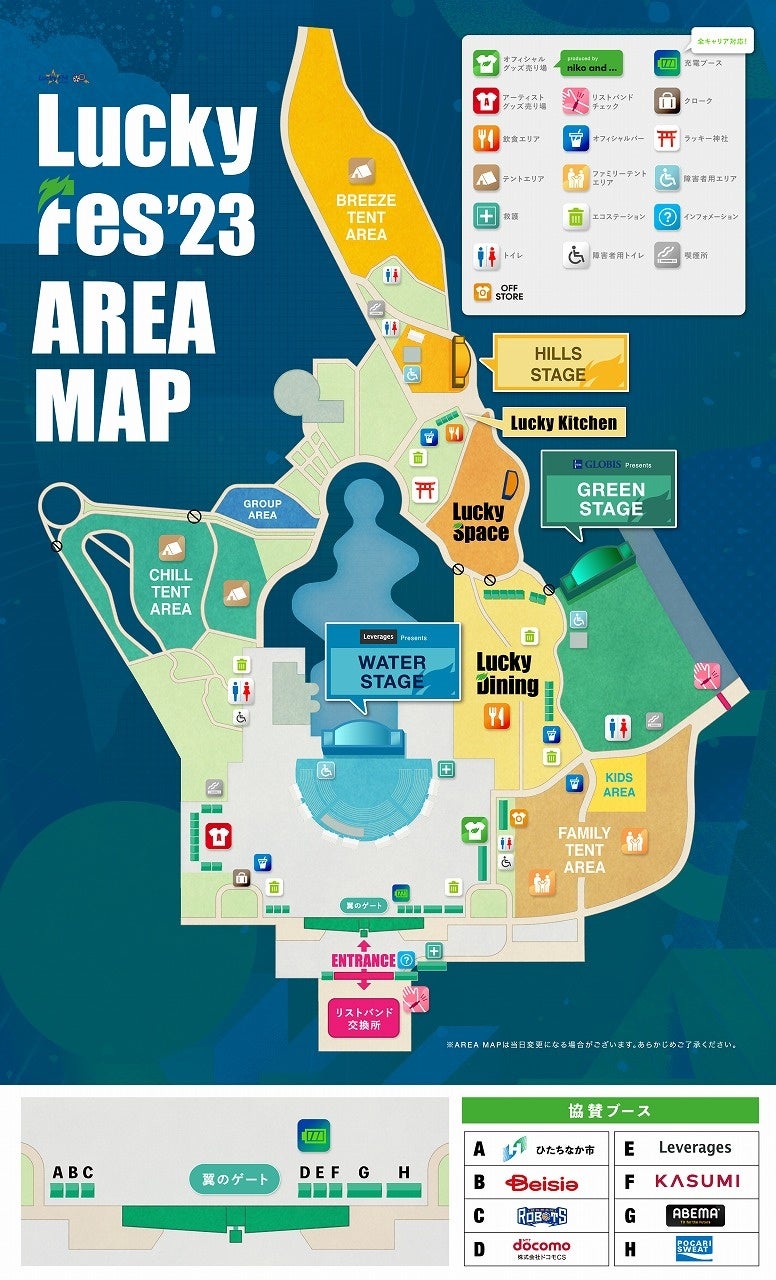 エリアマップの新設エリアとしては、フォトスポットとしても活用いただける「ラッキー神社」や茨城ゆかりのアーティストやお子様向けアーティストが出演する「Lucky Space」の場所を公開しました。昨年からの変更点として、テントエリアが拡張し、アーティストの物販が昨年LuckyStageがあった場所へ移動、HILLS STAGEが昨年グループエリアがあった場所へ移動しました。