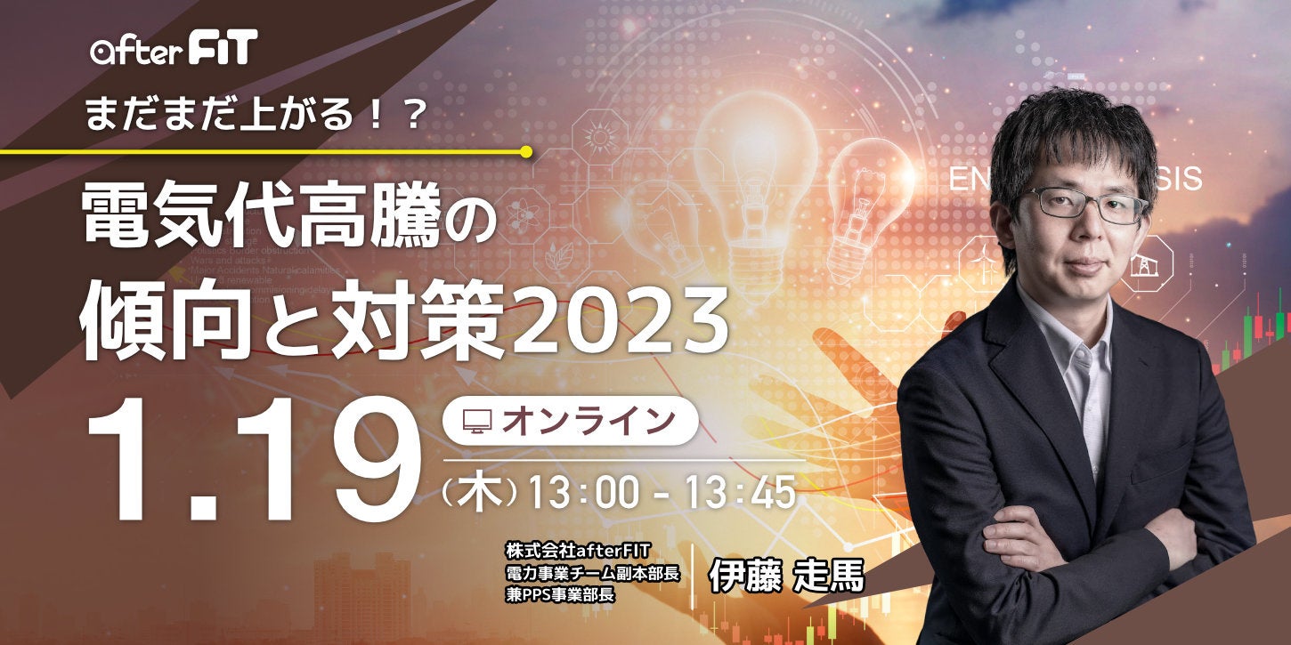 グリーンに特化した電力サービス「しろくま電力(ぱわー)」を運営する株式会社afterFIT(東京都港区、代表取締役:谷本 貫造)は、電力価格高騰に伴う大幅値上げや解約通知などを受け、具体的な電気代削減対策を検討されている企業を対象に、オンラインによる無料セミナーを2023年1月19日(木)に開催。2023年の電気代はどうなるのか?自社で取り組む電気代圧縮に向けた対策は何か?について解説します。