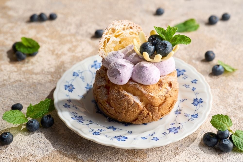 リソルの森の名物スイーツ「シュー・ア・ラ・クレーム」に、見た目にも愛らしく、爽やかな今季限定フレーバーが登場。丸く絞ったブルーベリークリームの中には、ライムを効かせたブルーベリージャムを忍ばせました。