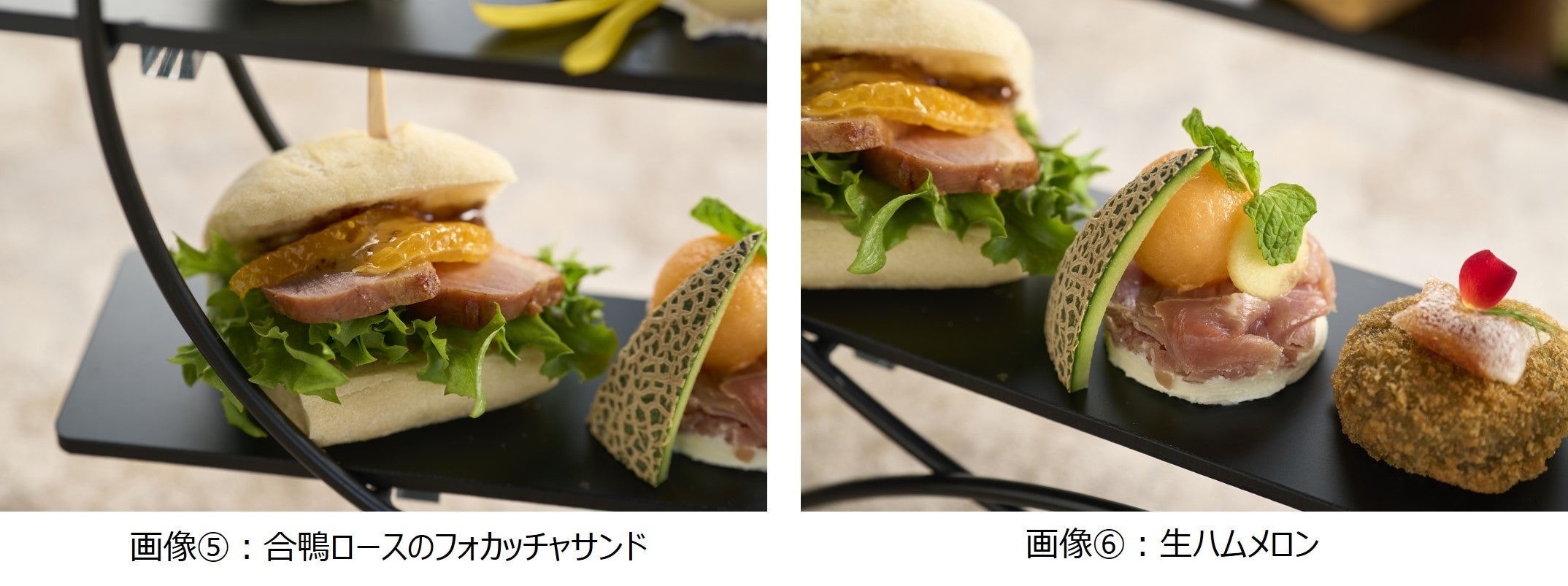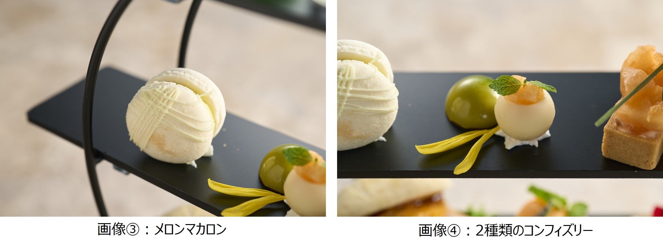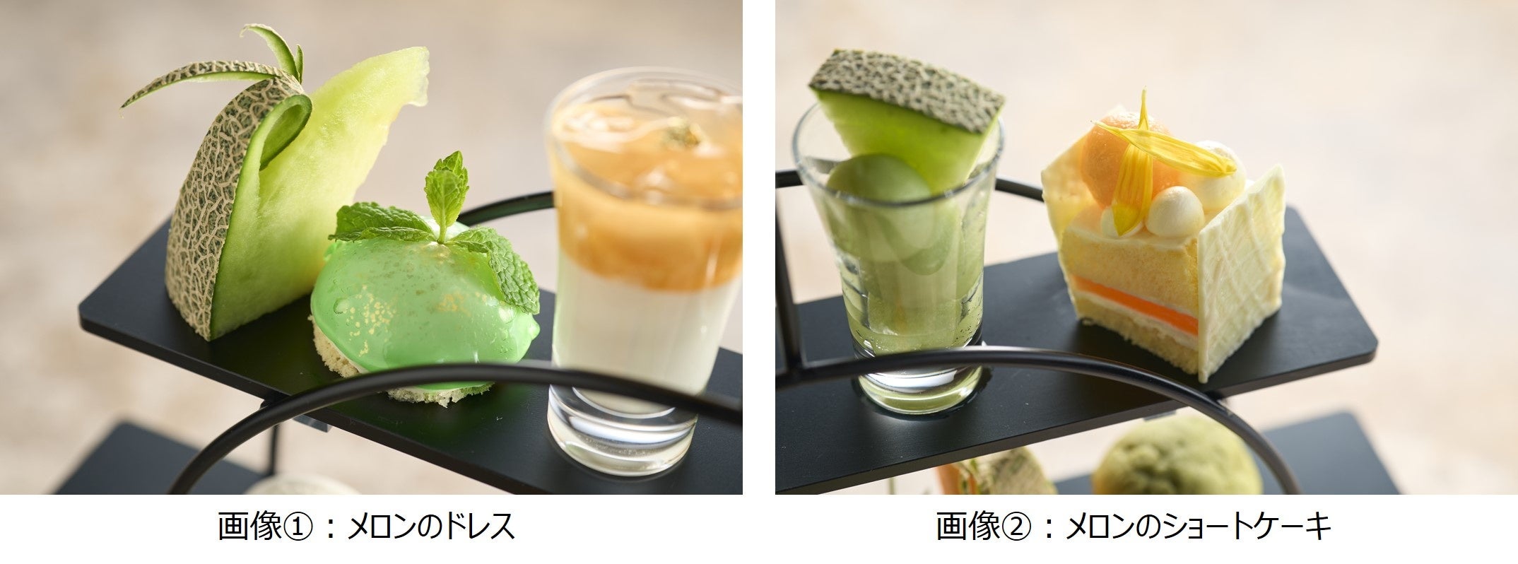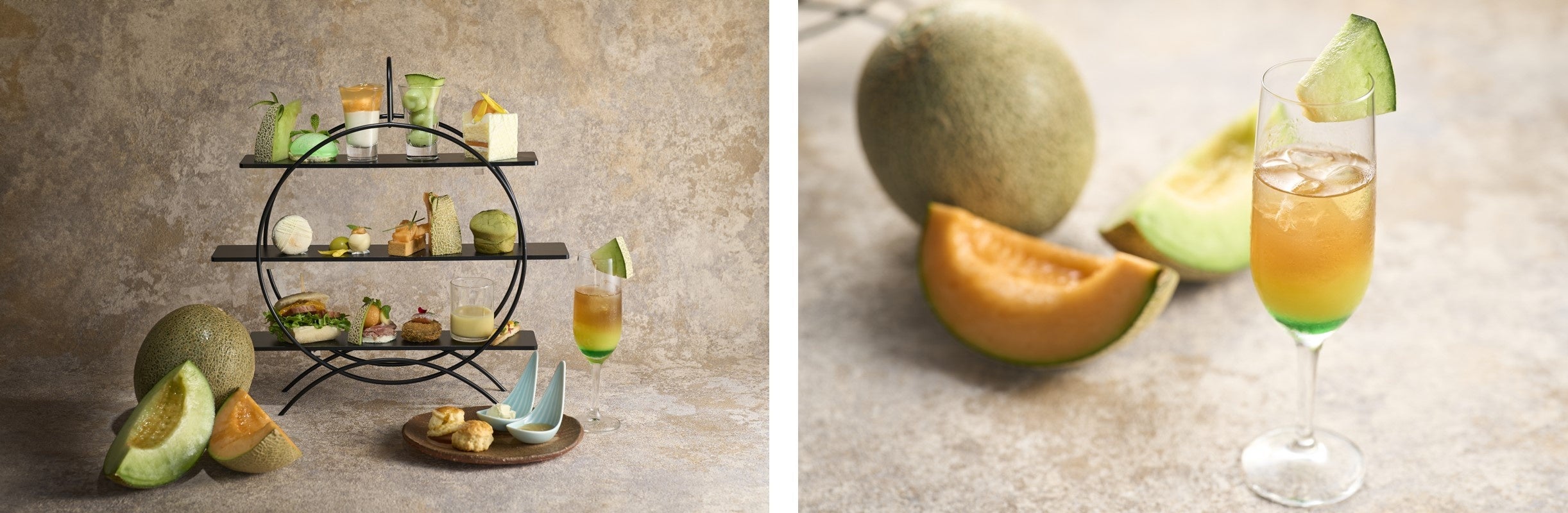 メニューは、ウェルカムドリンクの「メロンボール」をはじめ、マスカルポーネとサワークリームのムースの中にメロンソースを忍ばせた「メロンのドレス」や、ふわっと焼き上げたスポンジに特製生クリームとメロンクーリをサンドした「千葉県産赤肉メロンのショートケーキ」などのスイーツ、セイボリーとして「合鴨ロースのフォカッチャサンド」や「生ハムメロン」、クロテッドクリームとレモンの花のはちみつを添えたプレーンとマンゴー2種類の自家製スコーンなど、全15品にお飲み物が付いた、贅沢なアフタヌーンティーとなっています。