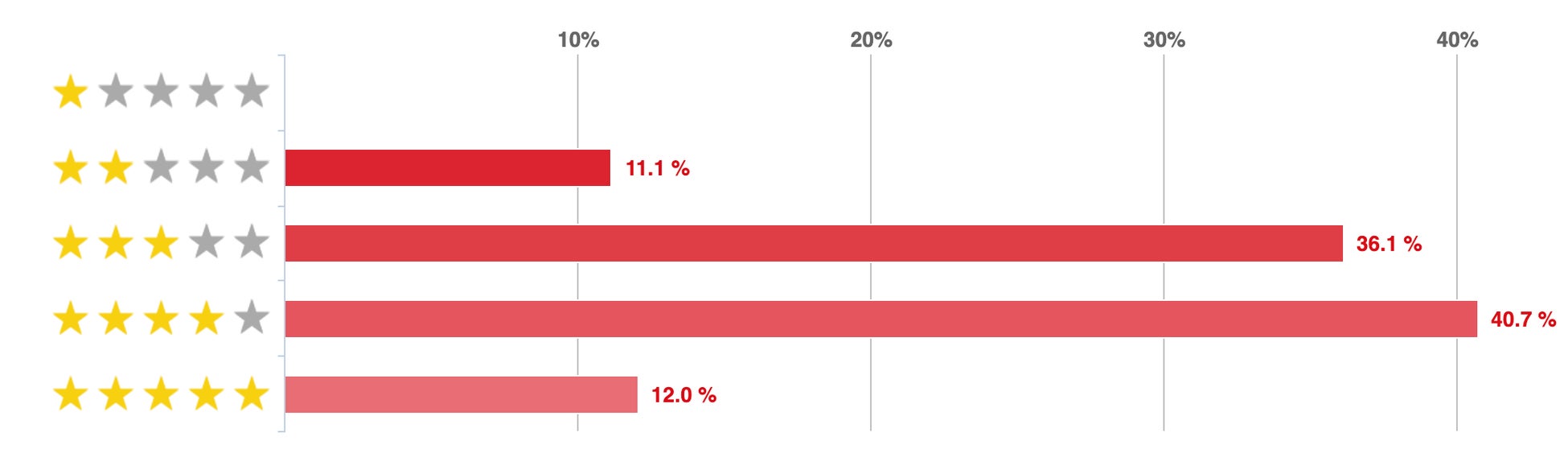 auカブコム証券に5段階評価をつけてもらったところ、5点と4点をつけた回答者の割合が合計で52.7%となった。また、1点をつけたユーザーが1人もいないことから、同証券のサービス品質は一定以上のクオリティであることが伺える。