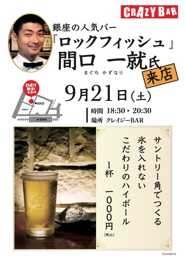 銀座の人気バー「ロックフィッシュ」の間口 一就(まぐちかずなり)氏が1日限定でクレイジーBARに来店!『サントリー角でつくる氷を入れないこだわりのハイボール』を提供いただきます。この機会に、間口氏の特別な一杯を堪能してみてはいかがでしょうか。