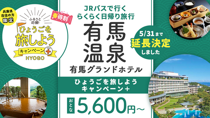 【5月31日迄延長!兵庫県民限定!】5,600円で往復JRバスで行く有馬温泉「有馬グランドホテル」豪華な昼食付温泉入浴付き日帰り販売開始