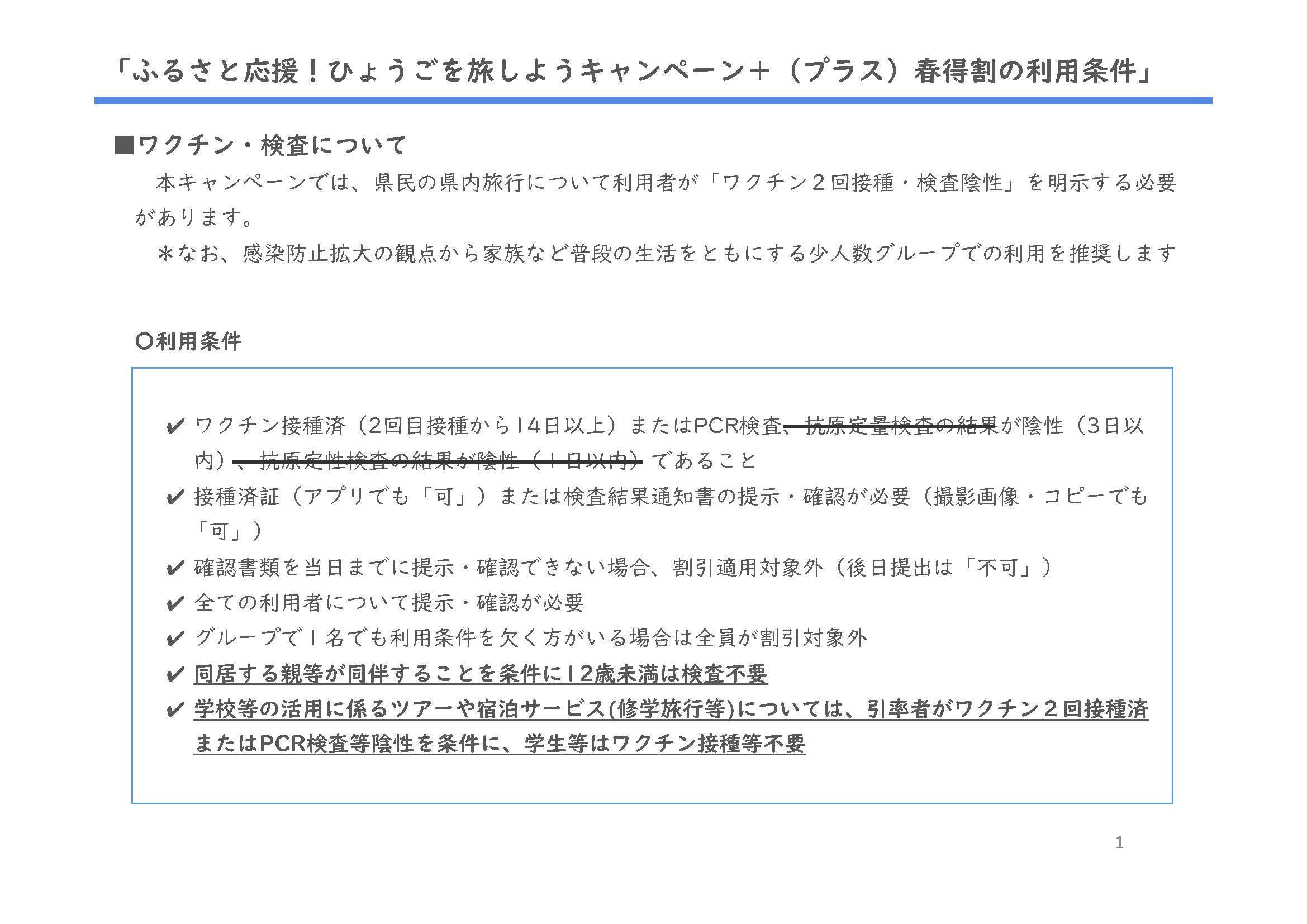 「ふるさと応援!ひょうごを旅しようキャンペーン」のご利用にあたっては、次の内容を必ず守っていただき、安全・安心なご旅行をお願いします。お約束、ご協力いただけない場合は、「ふるさと応援!ひょうごを旅しようキャンペーン」をご利用いただけません。 また、不正な手段などによりご利用された場合は、割引支援金の返還を請求することがあります。