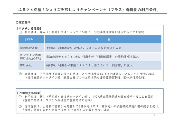 ●接種済証またはPCR検査等結果通知書(撮影画像、コピー、電子的な証明書でも可)の確認は、同行者も含めて旅行者全員について実施しますので、チェックイン時(旅行会社の場合は予約証明書等お渡しの来店時)にご提示ください。提示のない場合は割引支援を受けることができません。