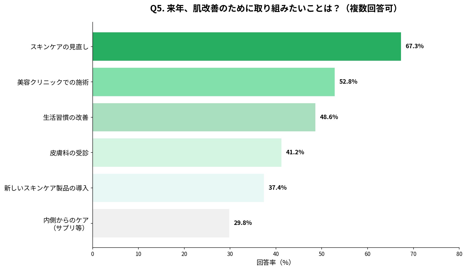 セルフケアだけでなく、専門的な施術への関心が高まっていることがわかります。Q2で「皮膚科・美容クリニックを受診しなかった」と後悔している方が多かったことを踏まえると、来年は行動に移したいという強い意欲が感じられます。