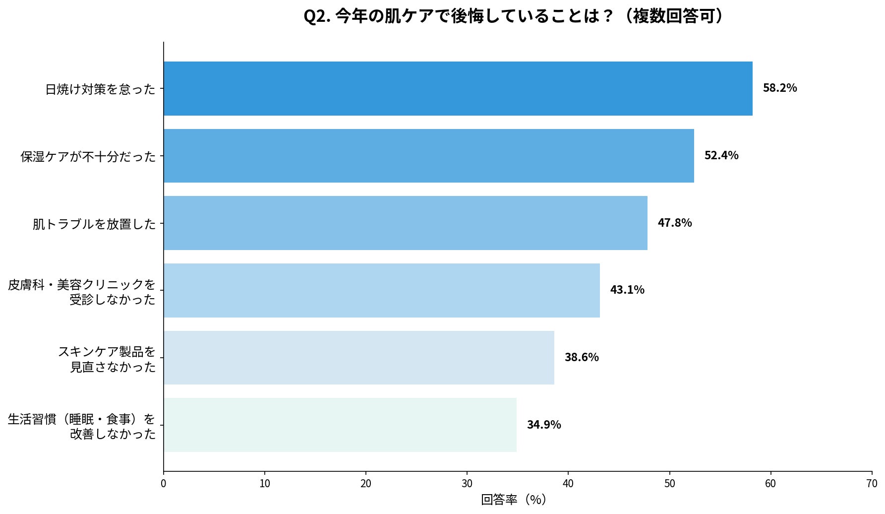今年の肌ケアで後悔していることを調査したところ、最も多かったのは「日焼け対策を怠った」(58.2%)で、次いで「保湿ケアが不十分だった」(52.4%)、「肌トラブルを放置した」(47.8%)という結果になりました。
