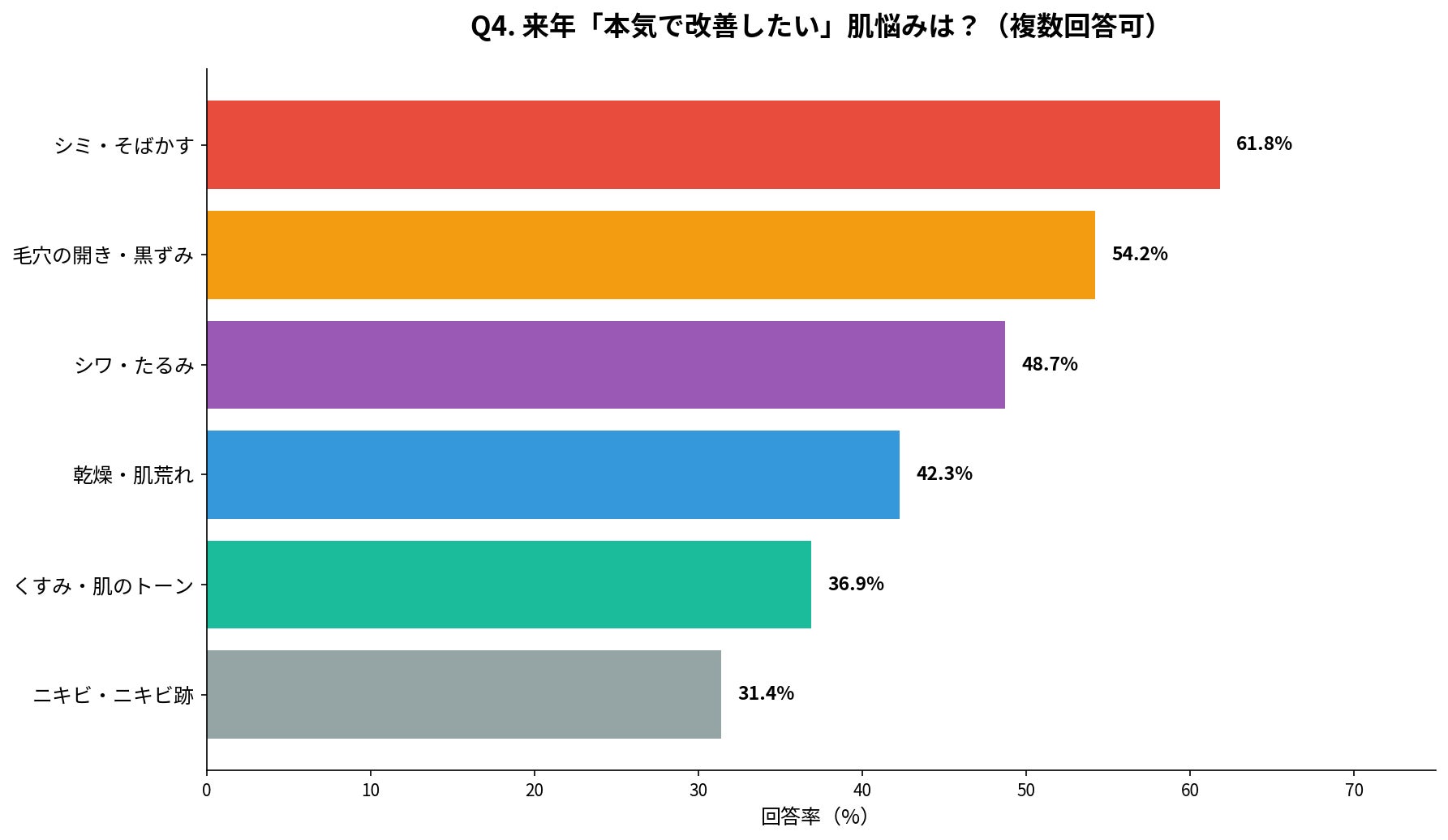 Q3で「今年一番気になった肌悩み」として挙げられた項目が、来年の改善意欲においてもそのまま上位にランクイン。今年解決できなかった悩みを「来年こそは」という強い意志で改善したいという心理がうかがえます。