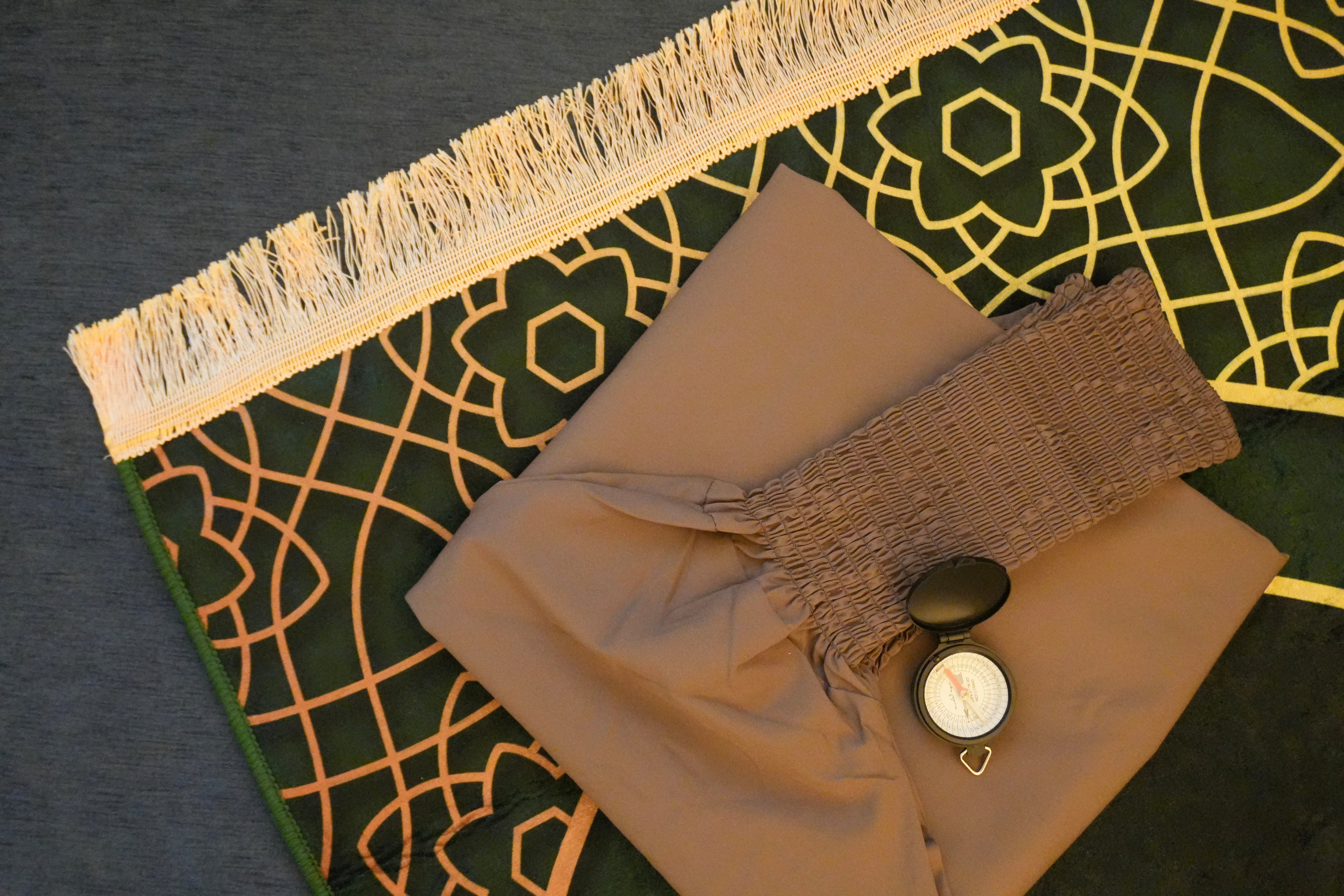 礼拝マット、キブラコンパス(メッカの方角を示すコンパス)など、礼拝に必要な備品一式 |