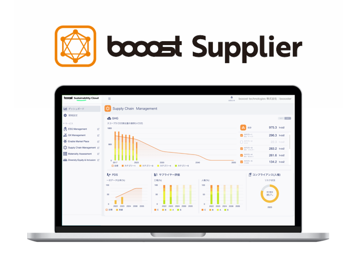 「booost Supplier」はbooost technologiesが提供するサプライヤーCO2排出量可視化ツールです。サステナビリティ経営の加速を支援するためのプラットフォーム「booost Sustainability Cloud」のアプリケーションの1つで、Scope3削減の実現に向けたサプライチェーンマネジメントツールです。多岐にわたるサプライヤー側のCO2等排出量管理が可能となり、サプライチェーン全体のCO2削減に向けた取り組みの進捗管理の効率化に貢献します。
