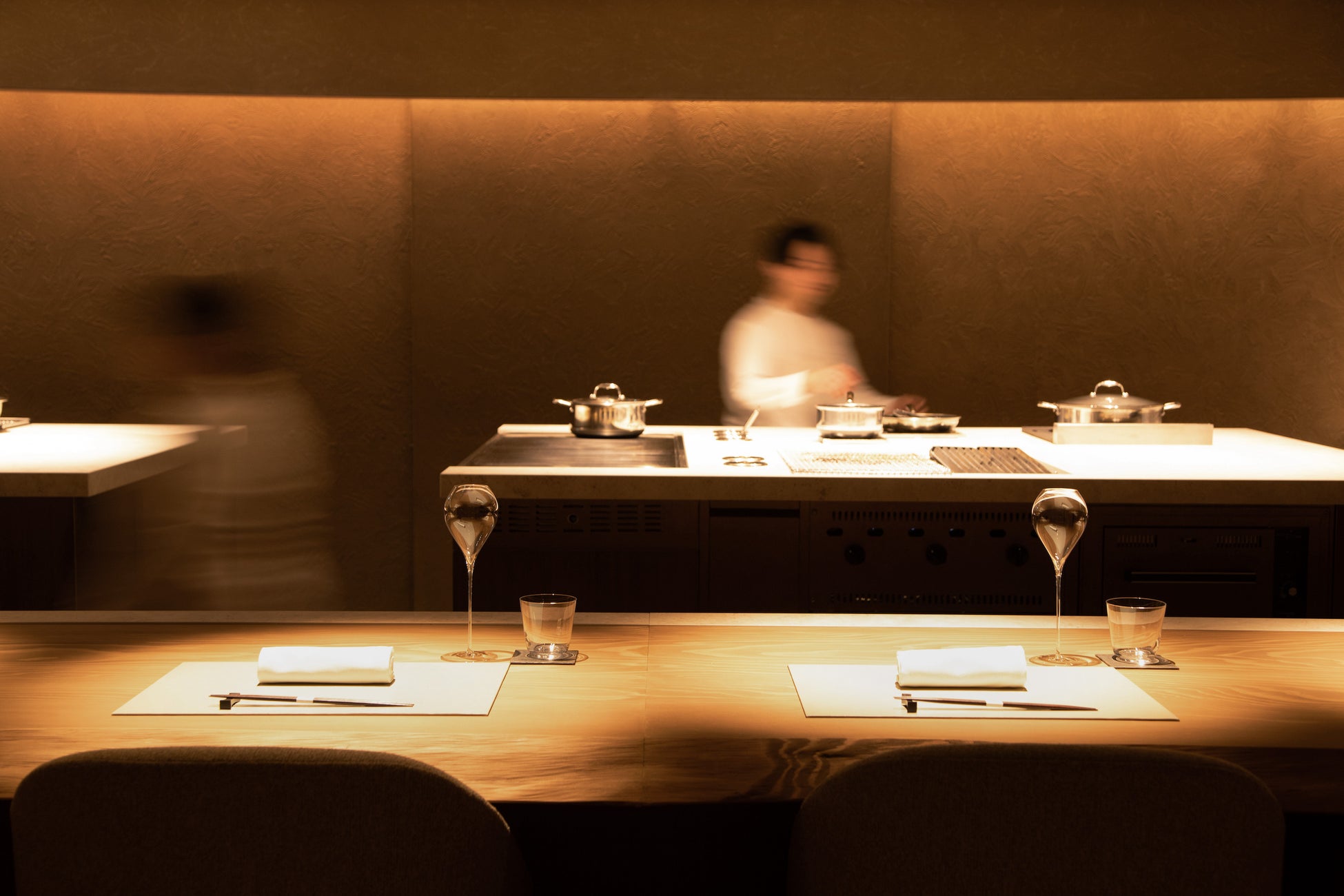 再開発が進む渋谷の街の喧騒から、高層階へと移動することで得られる静寂と高揚感を表現した光に包まれた空間。フロントを抜け、ほどなくすると現れる印象的な扉を開くと、そこに広がるのは、オープンで臨場感のあるキッチンと8席のカウンターと個室を備えた、シェフズテーブルのレストラン「FUSOU」です。