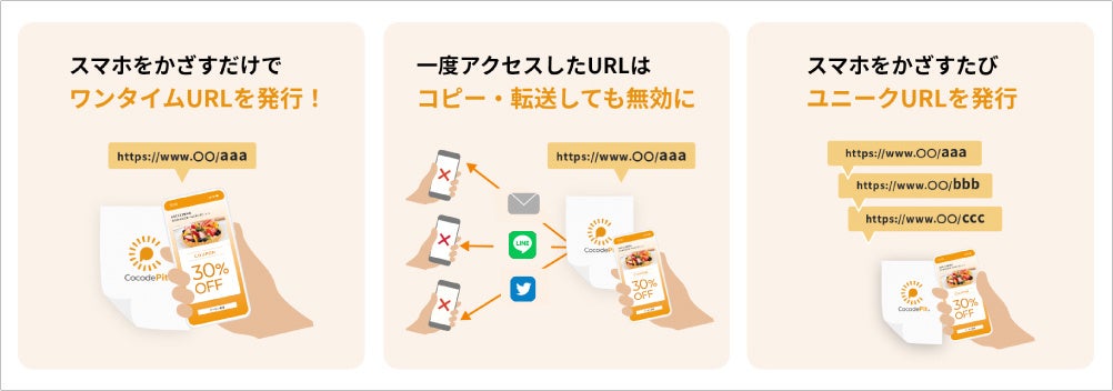 「CocodePitライト」は、薄型シールタイプのNFC(近距離無線通信規格)を活用したワンタイムURL発行機です。スマートフォンをかざすと、一度だけアクセスできるURLを電源無しで発行します。URLをコピー・転送しても無効となるため、現地訪問・商品購入などの条件を満たさないユーザーのキャンペーン参加・インセンティブ獲得をブロックすることができます。