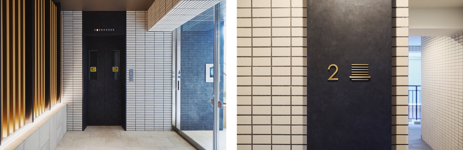 軒天のルーバーは、1階エレベーターホールの壁面に用いた縦ルーバーと色調を揃え、エントランスから上階までを繋ぐキーアイテムの役割を担っています。各階のエレベーターホールの階数表示においても、ルーバーをモチーフに取り入れています。