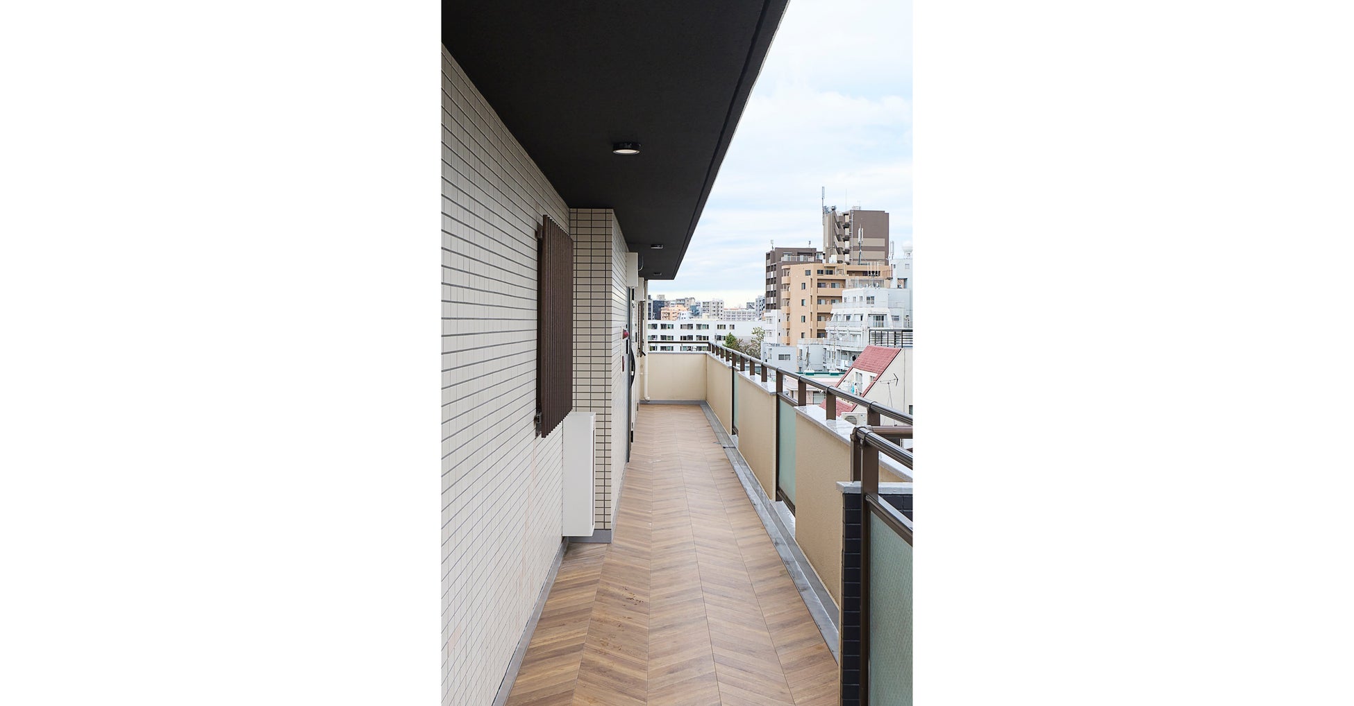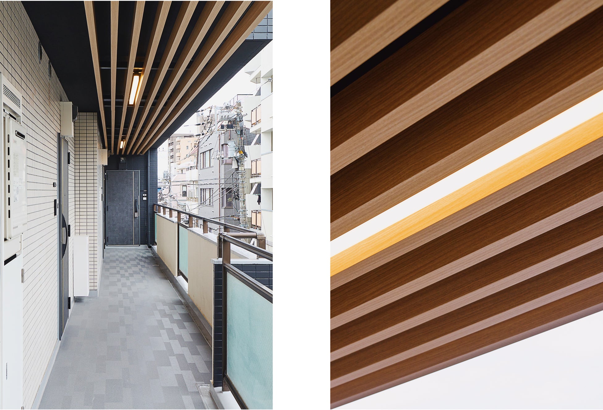 外廊下特有のマイナスイメージを和らげるため、廊下の軒天にルーバーを設置し、スタイリッシュな印象を加えました。床材においても方向性のある仕上げを採用することで、街のスピード感を表現しています。