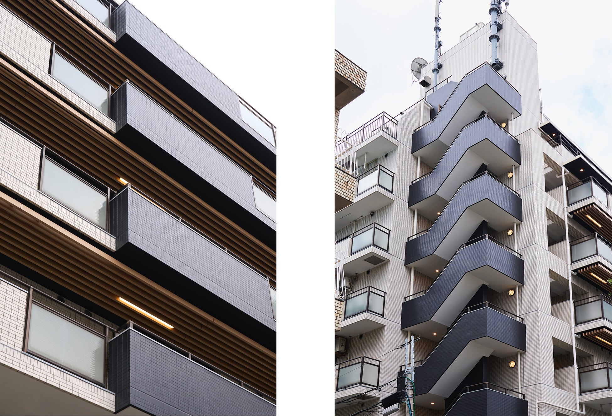 新宿という場所が持つ都市の多様性とミックスカルチャーをイメージし、外観をデザイン。ブラックとベージュのコントラストが、モダンで洗練された雰囲気を醸し出し、訪れる人々の目を引きつけます。当マンションは上り坂に位置することから、空とのエッジラインを際立たせるダークカラーを塗装色に選定しました。塗装範囲は、建物のボリューム感を残すために階段室と建物のコーナー部分に限定しています。