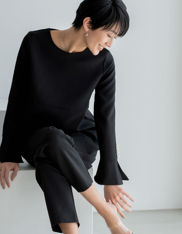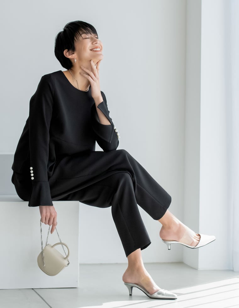 普段の仕事服や、セレモニー、特別なお呼ばれシーンなど、幅広いライフシーンに寄り添うパンツセットアップ。