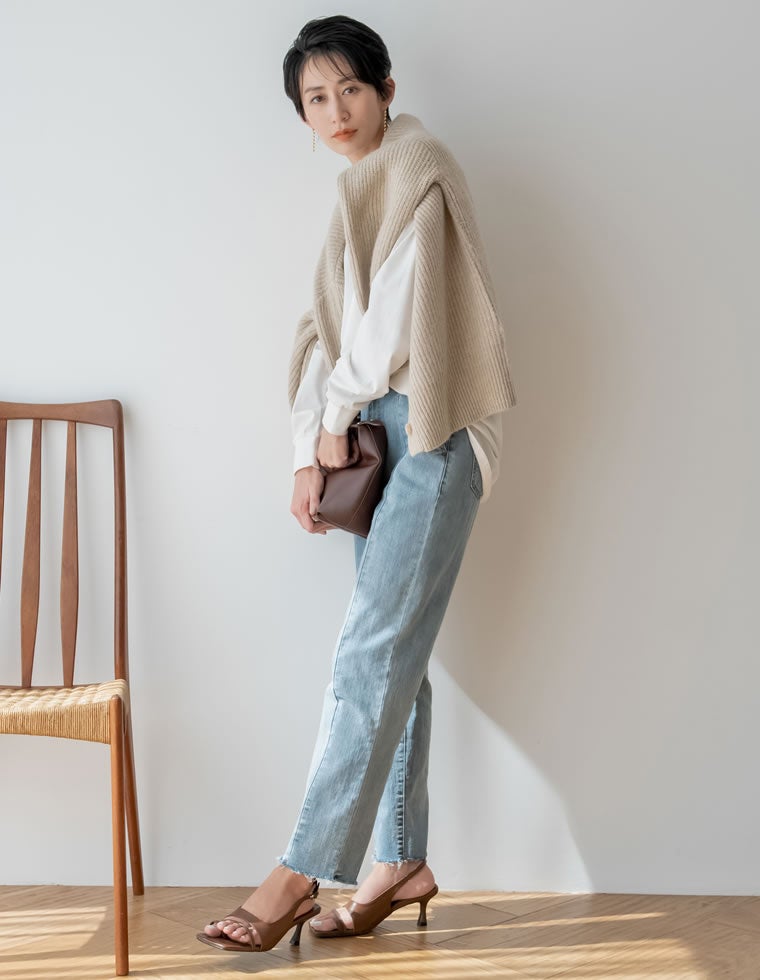 爽やかなブルーデニムは、裾がカットオフされたデザインで、抜け感のある大人コーデにアップデート。