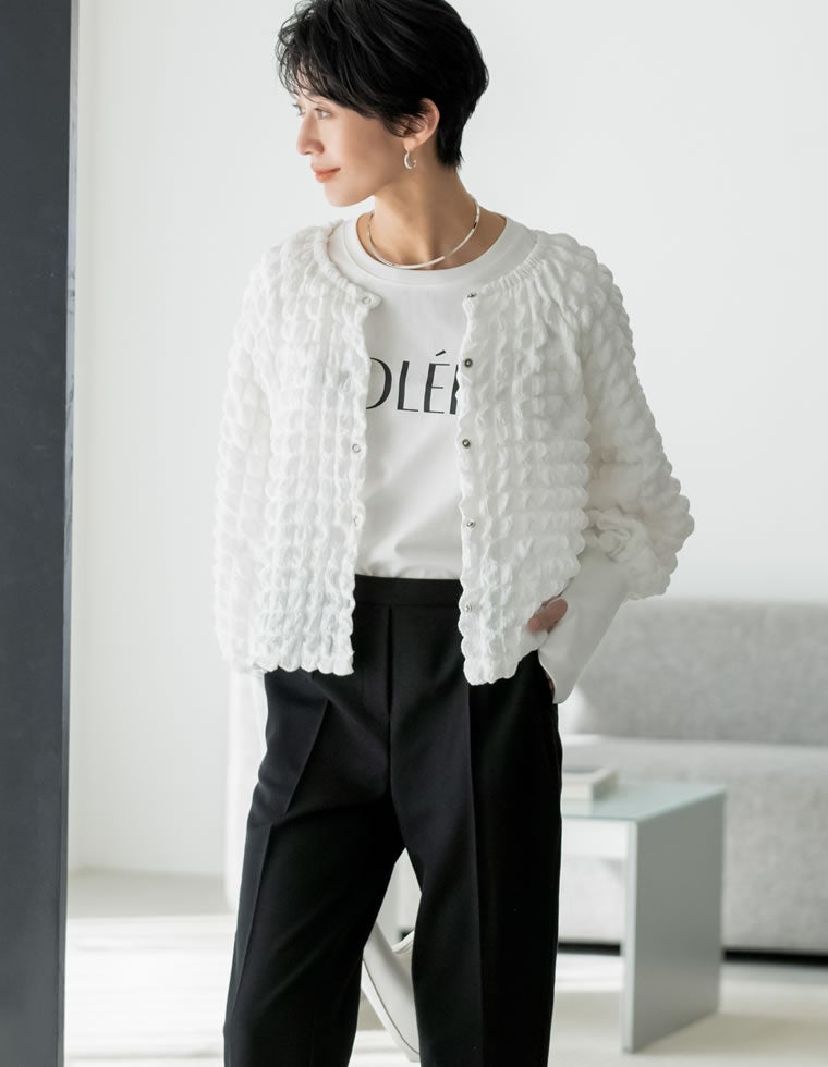 羽織りには、ぽこぽことしたポップコーンのようなジャガード生地でデザインした1枚をセレクト。