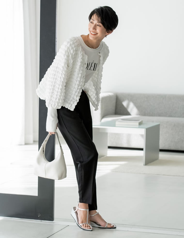 白黒を基調としたモノトーンコーデは、旬の生地感を取り入れて