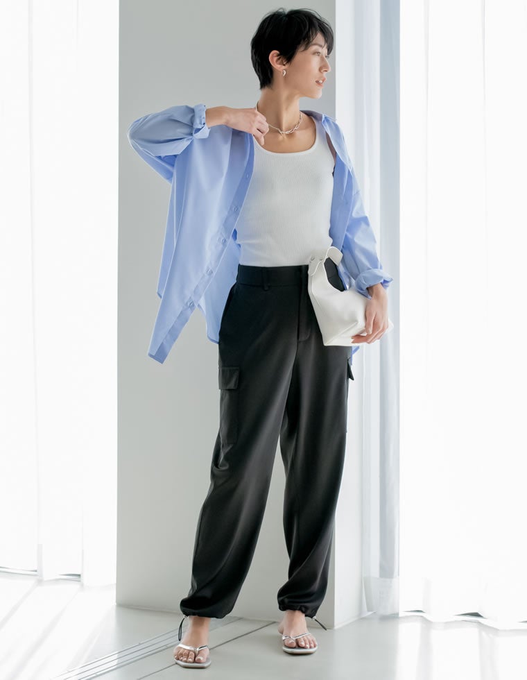 今季トレンドのカーゴパンツは、サテン素材を使用することで落ち感を演出し、メンズライクな印象を和らげ、レディな印象をプラスしてくれます。
