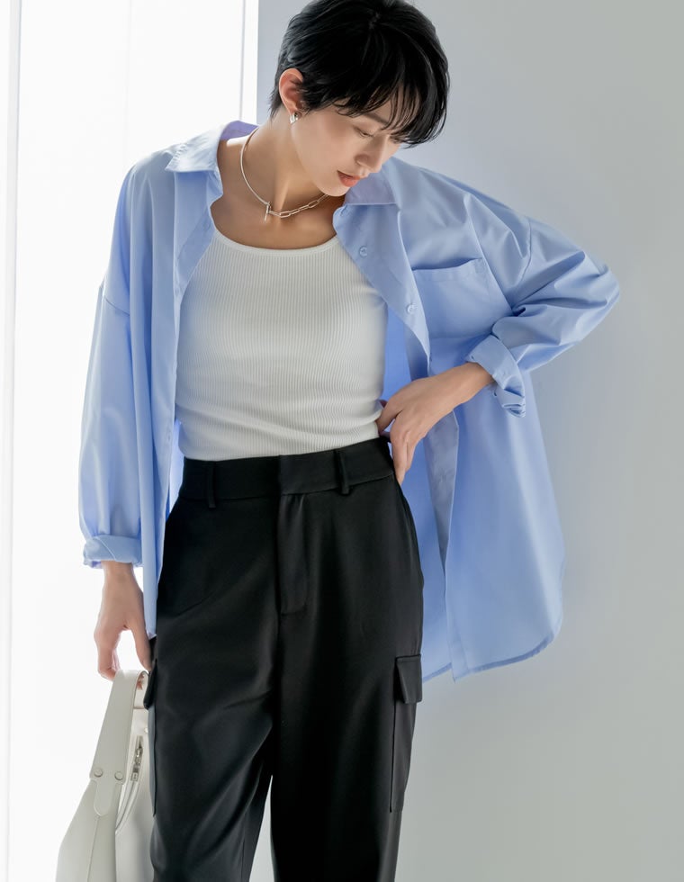 爽やかなブルーのオーバーサイズシャツは、さらりと羽織るだけでぐっとシーズンムード高まる装いに。