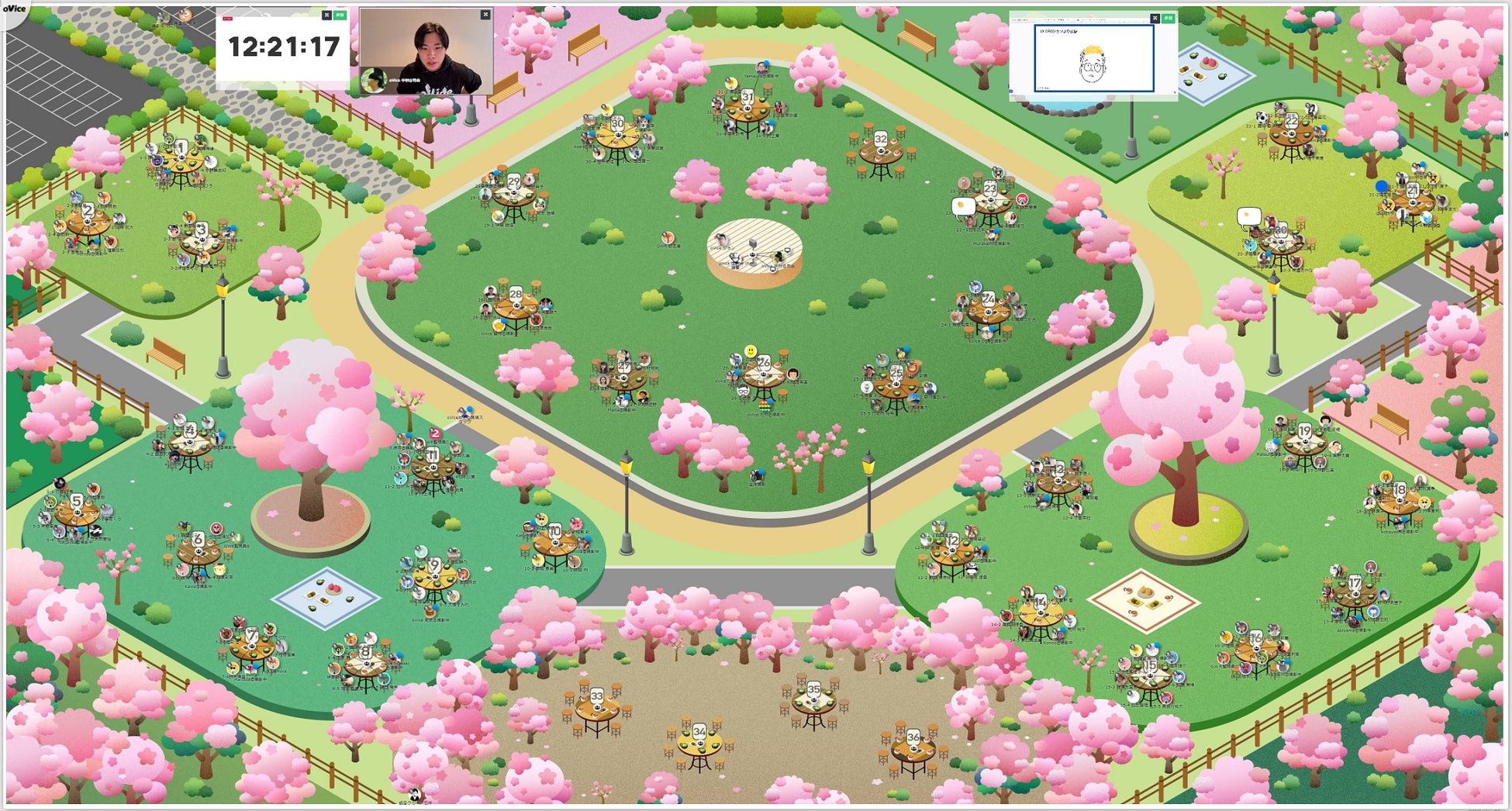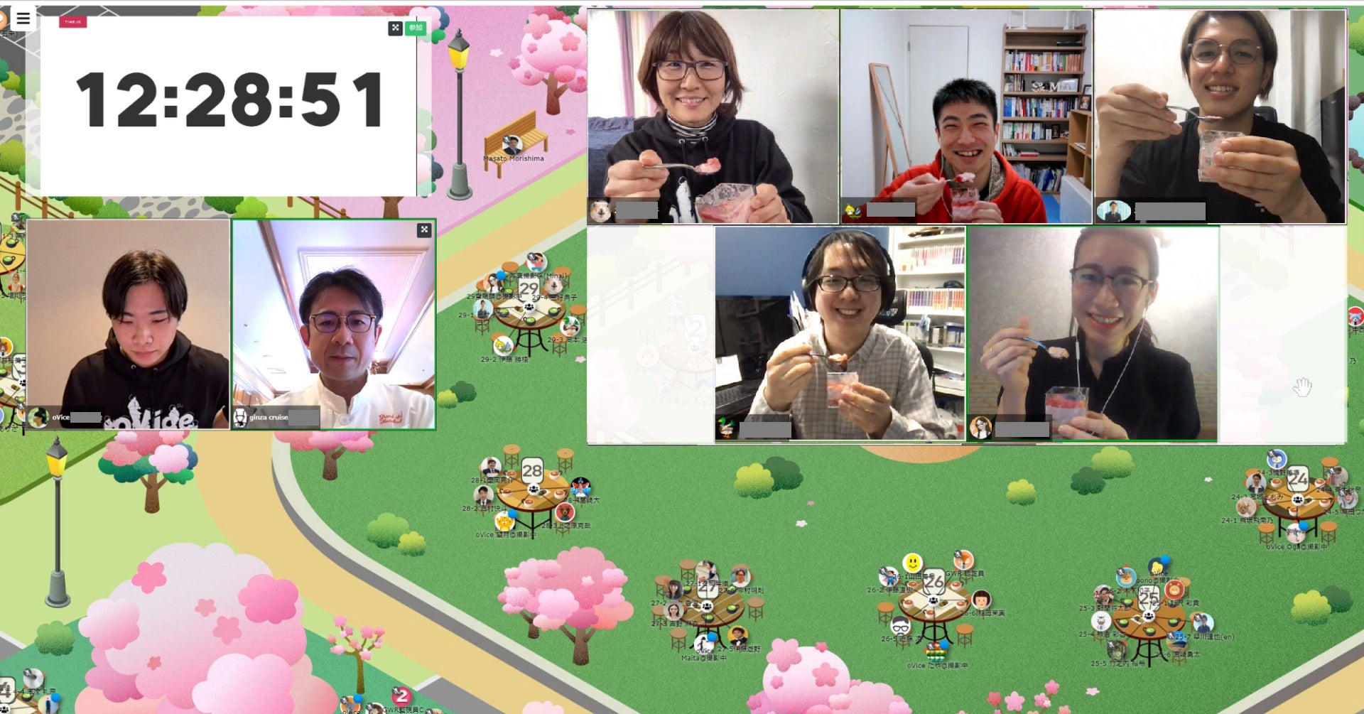 ランチの時間を有効活用して、より多くの方に仲間とのコミュニケーションを促進するオンライン交流を楽しんでいただきたいと考え、本挑戦を実施しました。挑戦当日はoViceやご賛同企業から166人がバーチャル空間上に集合。5~7人のテーブルに分かれ、満開の桜で埋め尽くされたバーチャル空間「oVice」上で、桜をモチーフにした3種類のケーキを試食しました。
